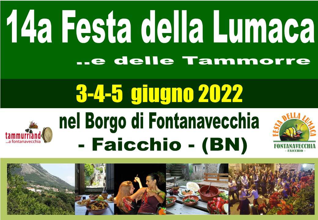 Il piccolissimo Borgo di Fontanavecchia di Faicchio, ospiterà da venerdì 3 a domenica 5 giugno 2022, la 14° edizione della “Festa della Lumaca e delle Tammorre”, organizzata dall’Associazione “Fontanavecchia” Nel borgo di Fontanavecchia, i profumi della natura si mescolano da secoli con quelli di una cucina tradizionale, dove le lumache rappresentano la più alta espressione culinaria di questaContinua a leggere “14° Festa della Lumaca e delle Tammorre a Fontanavecchia di Faicchio”